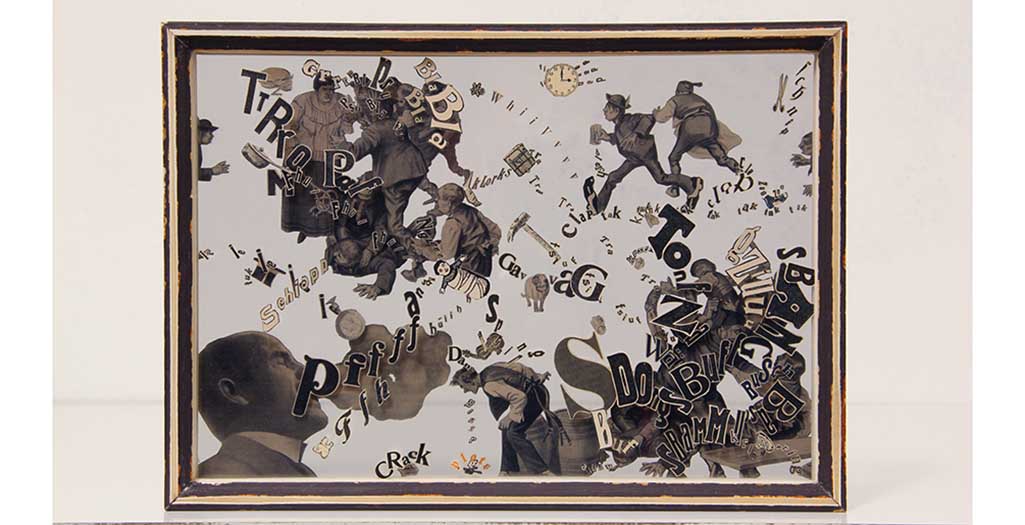2014 / Illustration and lettering of magazine, paste, frame, acrylic sheet, glass / Translation in German, Greek, Italian / 14,5×19,5×2,8 cm