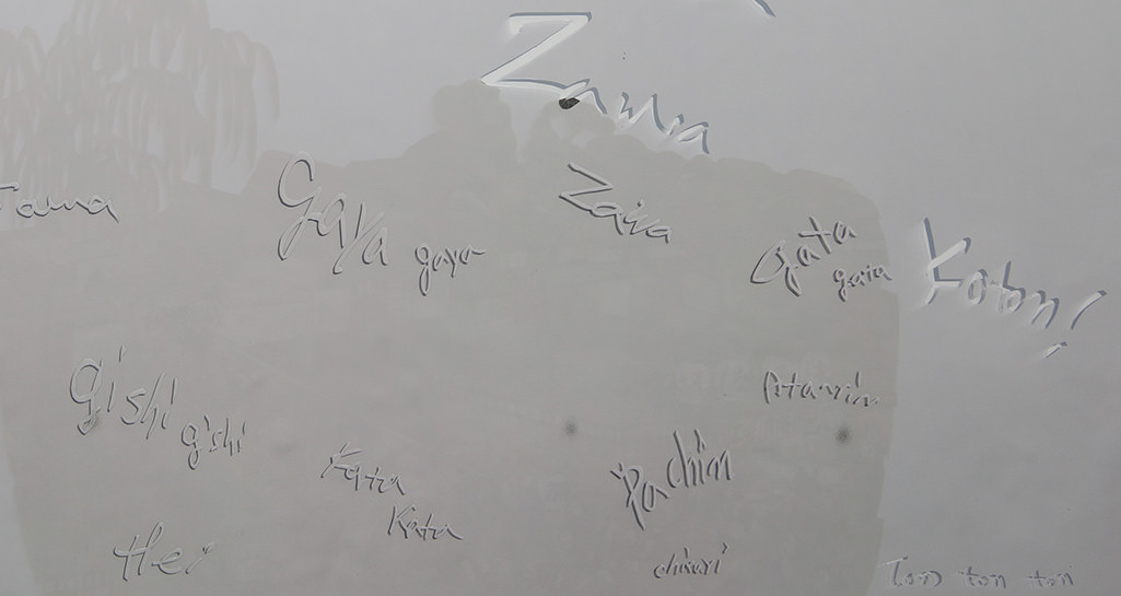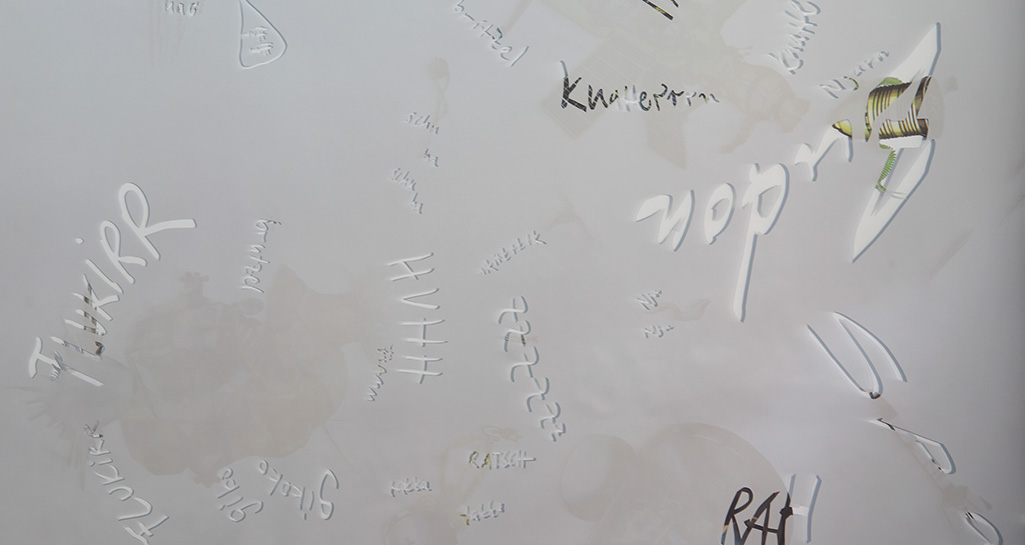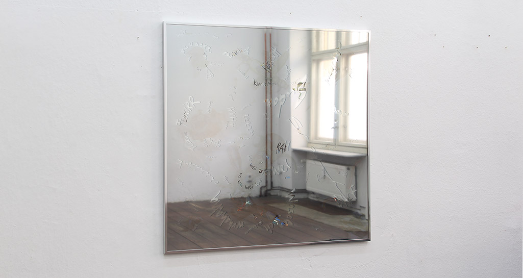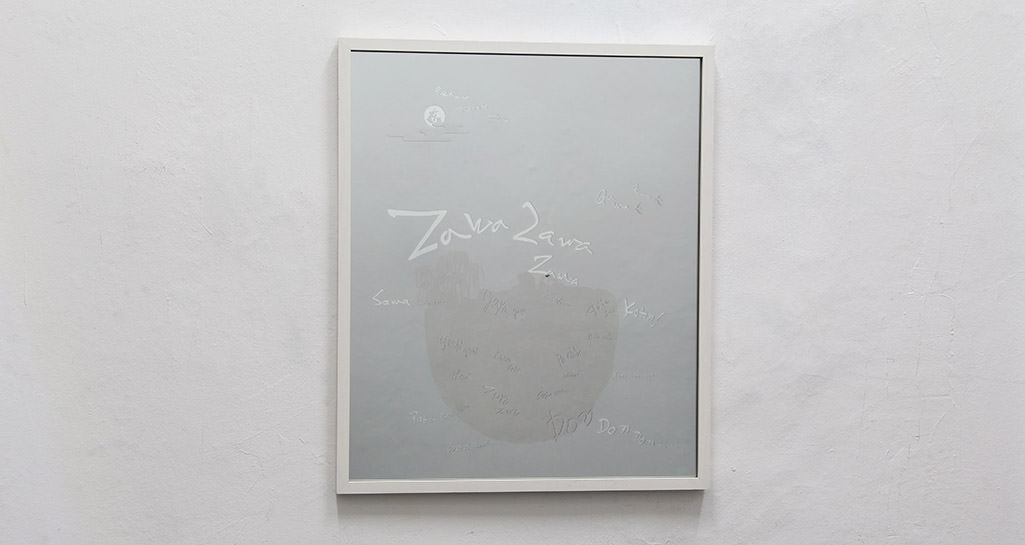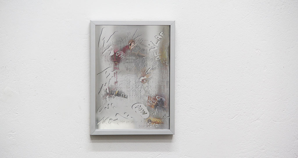 2015 / Illustration of engraving, acrylic mirror sheets, one-way mirror sheets, glass, frame / Translation in Japanese / 62,5 x 52,5 x 2,5 cm