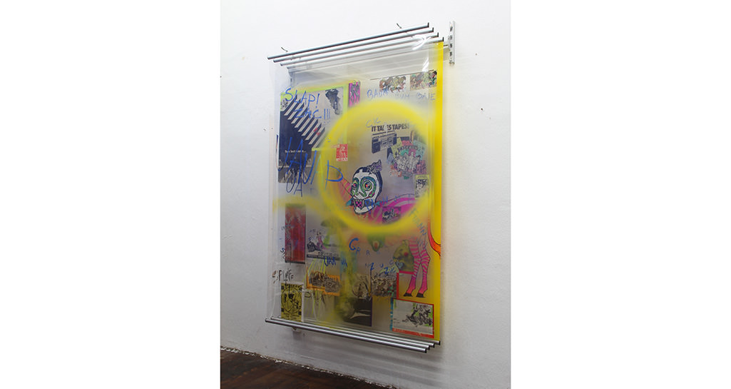 2016 / Illustration of magazine “New Musical Express” from the early 1980s, polyester film, poster hanger, vinyl film, spray paint, marker pen, pastel, colored pencil / translation in Italian / 183 x 120 x 30 cm